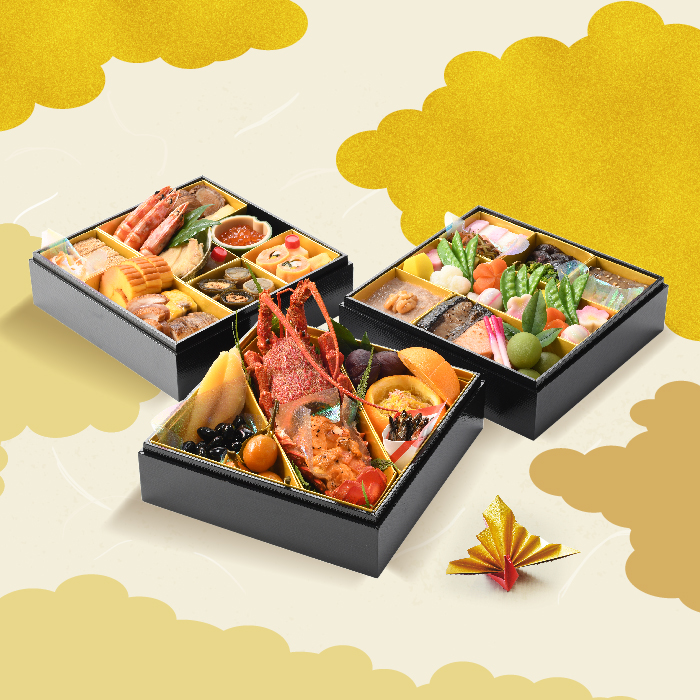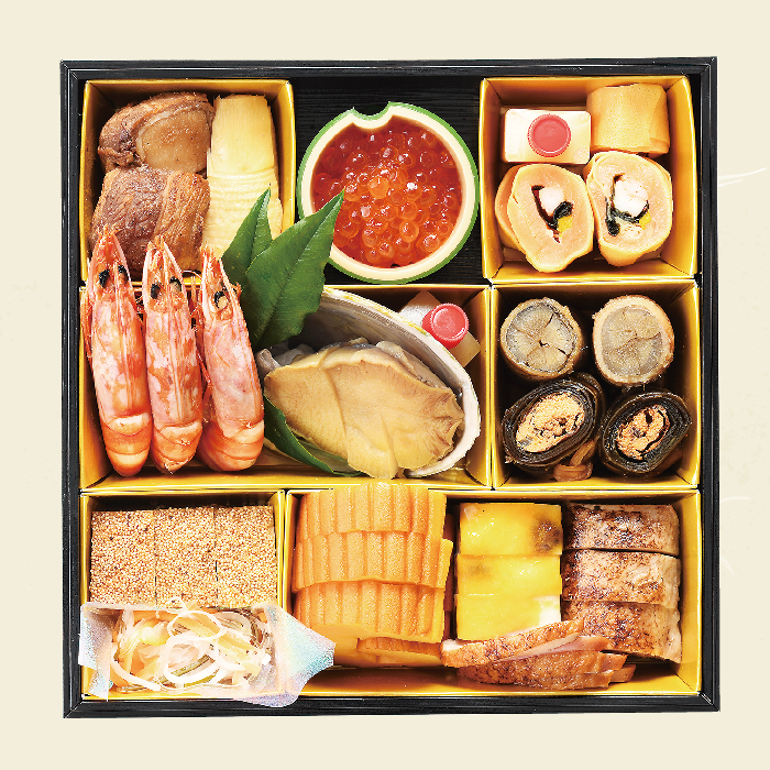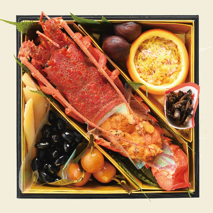 ロックロブスターうに焼き、丹波黒豆、数の子、田作り、柚子釜(ずわい蟹菊花漬け)、金柑甘露煮、栗渋皮煮