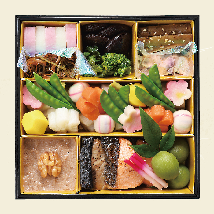 くるみ金団、里芋白煮、梅長芋レモン煮、鮭柚庵焼き、花蓮根煮、手毬麩・梅麩、鰤西京焼き、叩き牛蒡、海鼠吟醸漬け、青梅甘露煮、椎茸旨煮、絹さや、紅白蒲鉾、慈姑煮、紅白はじかみ、松前漬け、梅人参、菜花昆布〆