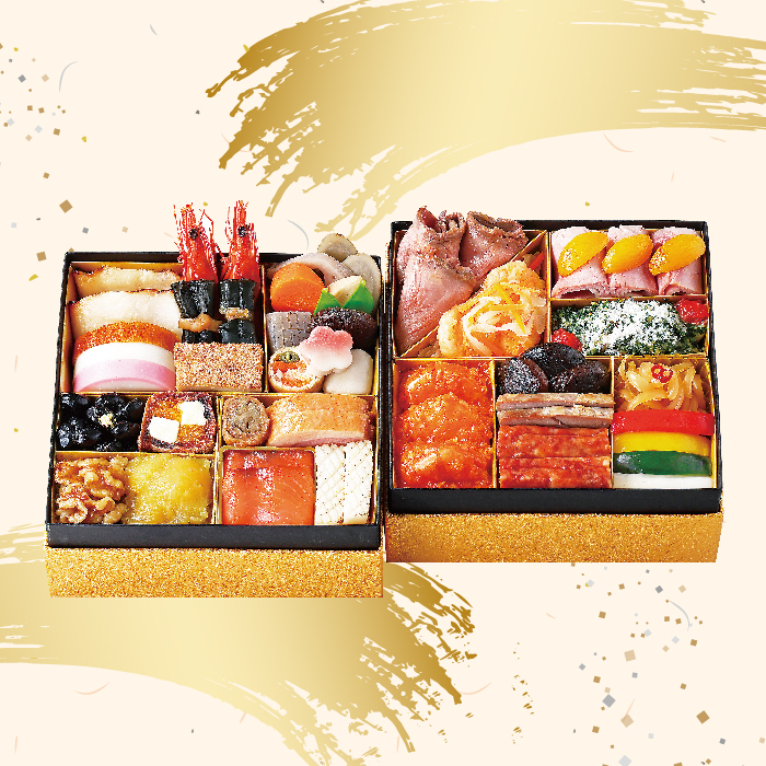 カラス鰈西京焼き、有頭海老、一口昆布巻、鶏松風焼き、蒲鉾(赤・白)、伊達巻、杏子市松、大黒豆(金箔飾り)、栗きんとん、くるみ佃煮、穴子八幡巻き、合鴨スモーク、スモークサーモンマリネ、松笠いか照焼き、煮〆(牛蒡・蓮根・筍・人参・椎茸・鹿の子こんにゃく・里芋・揚野菜巻・花麩・絹さや)