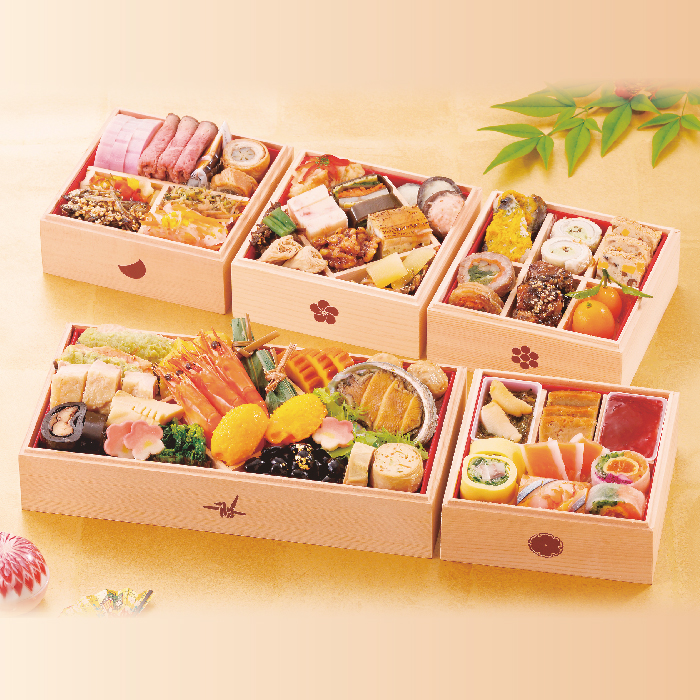 見た目は3段重ですが、5つに分かれたお重に彩りよく盛り合わせたボリュームたっぷりのおせちです。