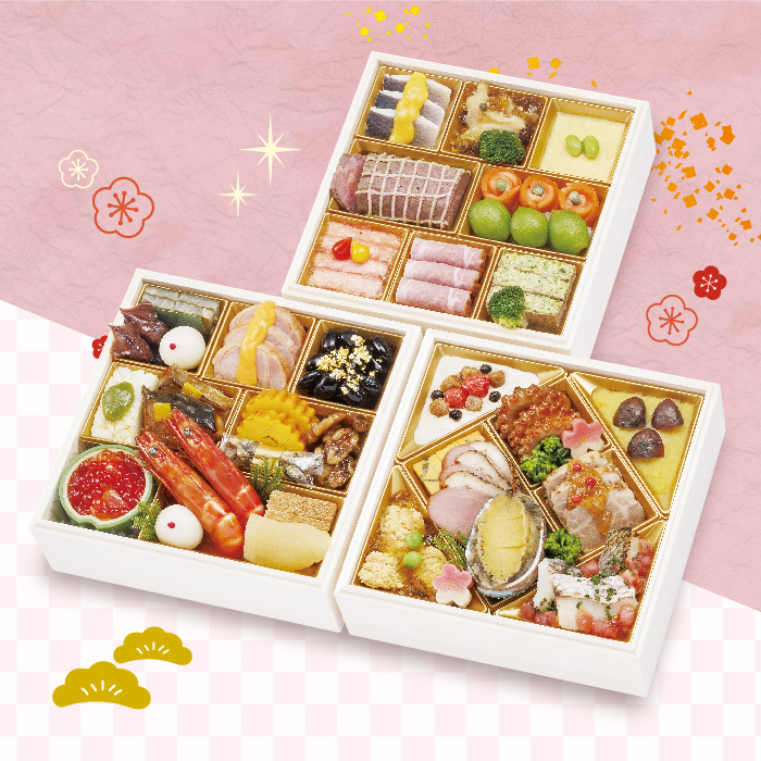 鶏の燻製チーズソース掛け、黒豆金箔、炙り烏賊の翡翠味噌掛け、ほたるいかしぐれ煮、柚子餡餅、鰤照焼、大豆やわらか煮、伊達巻柚子風味、くるみ甘露煮、田作りカシューナッツ和え、鮭ルイベ漬いくら掛け、海老旨煮、トリュフ入りレーズン松風、数の子醤油漬、かじき昆布〆
