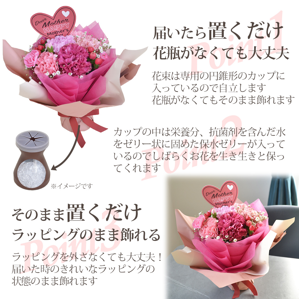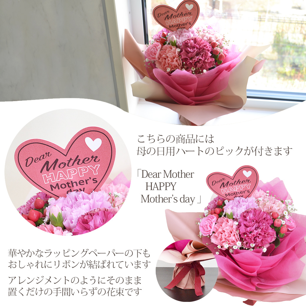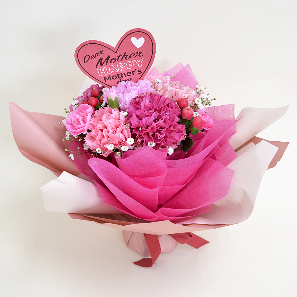 母の日に人気のお花、カーネーションをたっぷりカスミソウとあわせてピンク系で可愛くアレンジし華やかにラッピングした自立するスタンディングタイプの花束です。