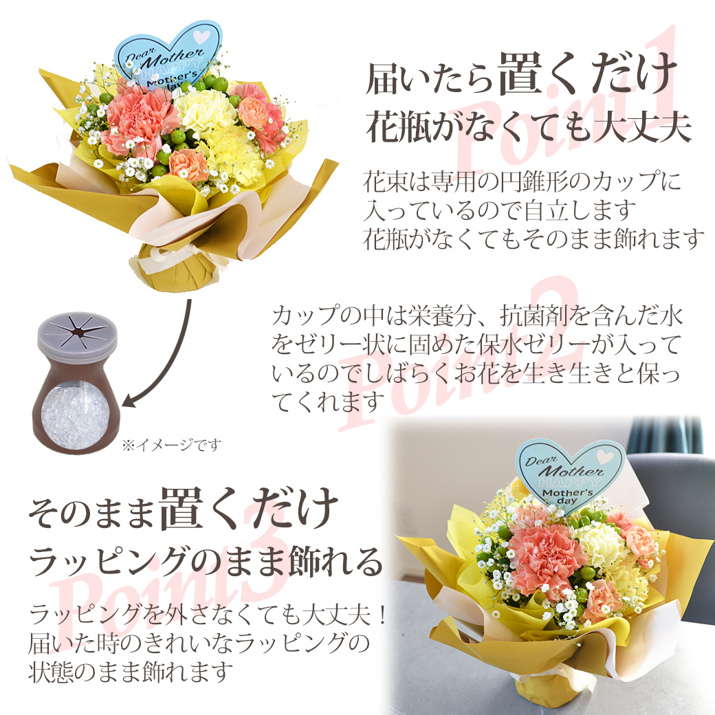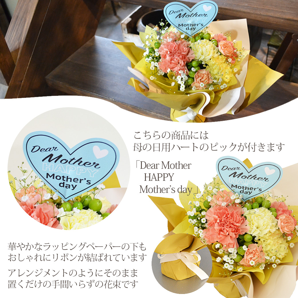 母の日に人気のお花、カーネーションをたっぷりカスミソウとあわせてビタミンカラーで可愛くアレンジし華やかにラッピングした自立するスタンディングタイプの花束です。