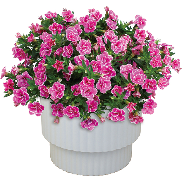 ビビットピンクがキュートなバラ咲きのスーパーベルです。※鉢のデザインが変更になる場合がございます※つぼみの多い状態でお届けします