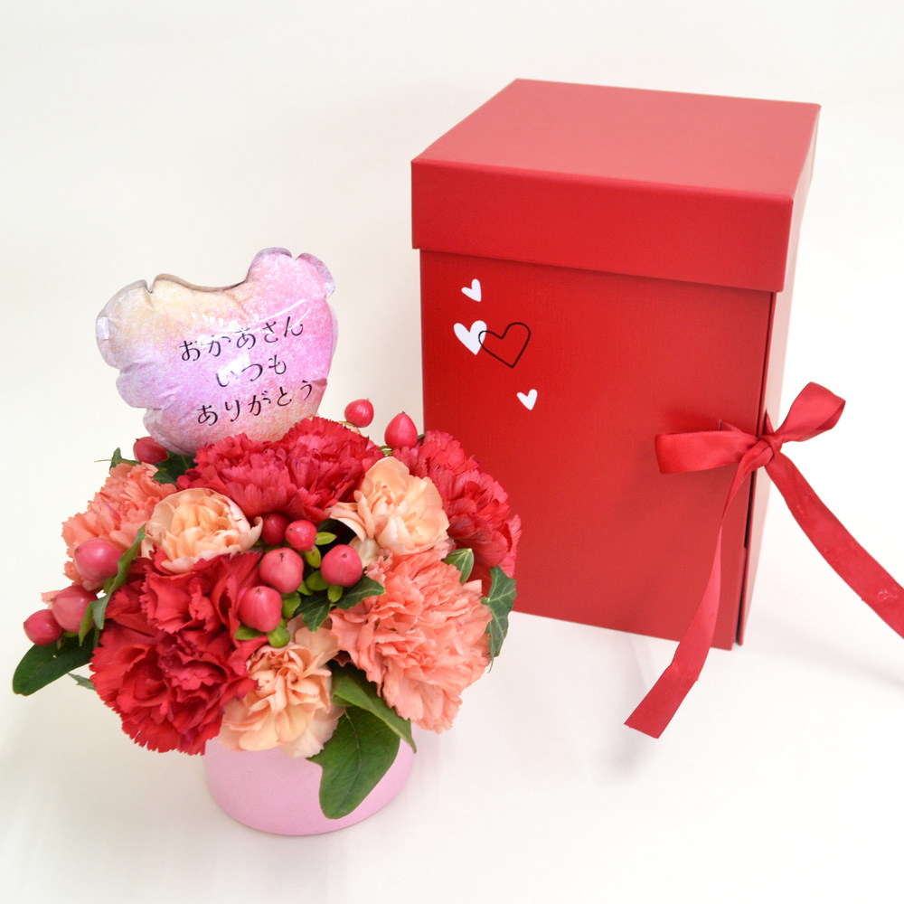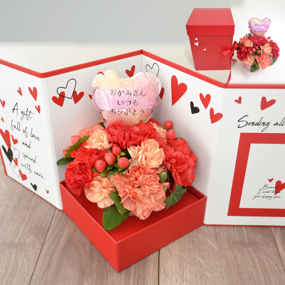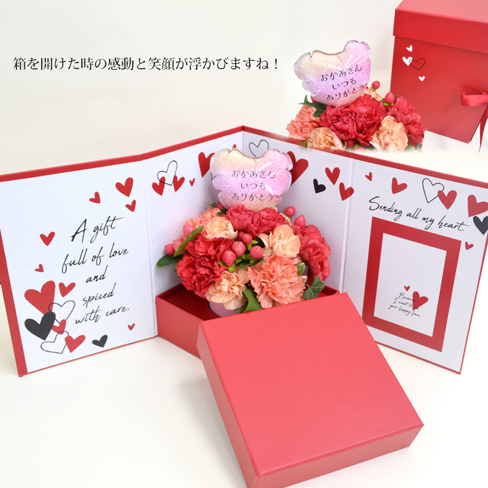 赤とオレンジのカーネーションのお洒落なアレンジメントを、箱を開くとステージのように飾れるギフトボックスにセットしてお届けします。