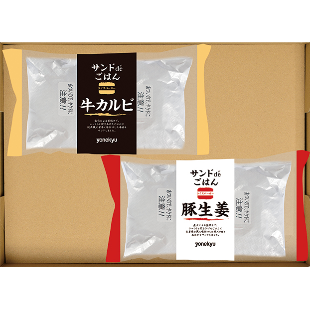 牛カルビと豚生姜。2種類の具を直火釜炊きでふっくら仕上げたご飯でそれぞれサンドしました。